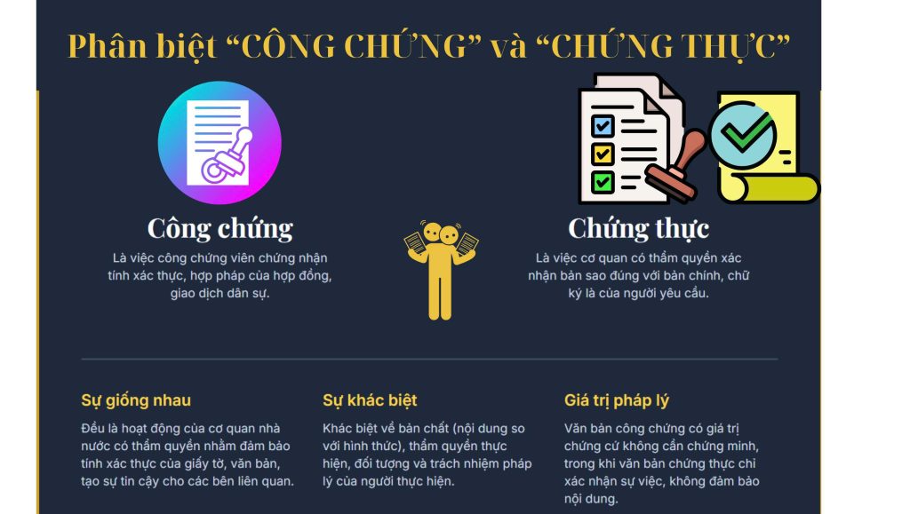“Công chứng” và “Chứng thực” là hai nghiệp vụ pháp lý quan trọng, thường gây nhầm lẫn do đều liên quan đến việc xác nhận tính xác thực của giấy tờ, văn bản. Tuy nhiên, về bản chất, thẩm quyền, đối tượng và giá trị pháp lý, hai hoạt động này có những điểm giống và khác nhau rõ rệt.